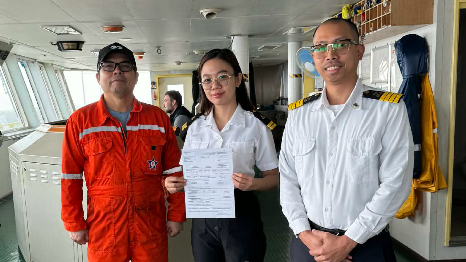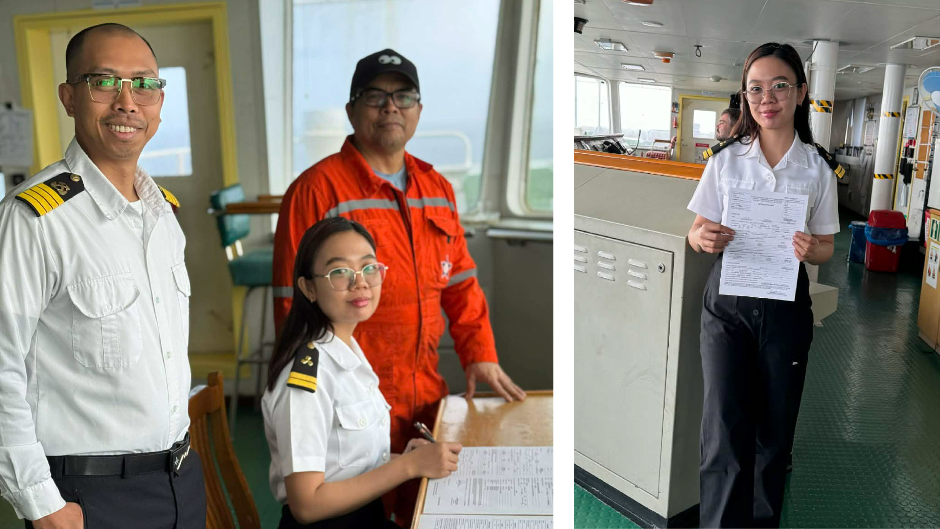Capt. Sherwin Kim D. Batingal and Chief Engineer Jodito Pantonial share in this proud moment, recognizing the skill and character Noreen brings to her role aboard the vessel: